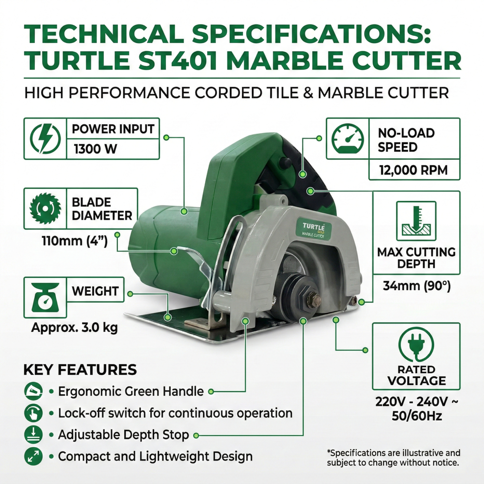 Manufactured under the Turtle brand and distributed across India by Sparkle Tools Pvt. Ltd. — headquartered in Rajkot, Gujarat — the ST401 is engineered for tradespeople who require a dependable, compact marble cutter for daily production use. Its 110mm blade compatibility ensures that replacement diamond blades are readily available at hardware stores and tool suppliers across the Indian market, keeping downtime and running costs low. The tool’s straightforward, no-excess design makes it a practical choice for tile contractors, stonemasons, and interior fit-out teams working within tight site budgets and schedules.
