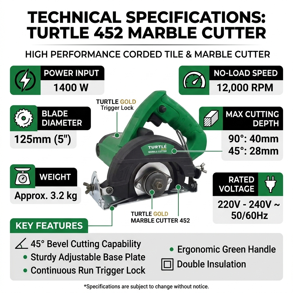 Manufactured under the Turtle brand and distributed across India by Sparkle Tools Pvt. Ltd. — based in Rajkot, Gujarat — the ST452S is positioned as a dependable mid-range marble cutter for stonemasons, civil contractors, interior fit-out professionals, and tile workshop operators. The double-insulated housing provides electrical protection in the dusty, partially wet conditions common across Indian construction environments. Its compatibility with all standard 125mm diamond blades ensures that consumables are easy to source across Indian hardware markets at accessible price points.